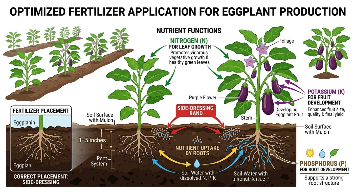 Eggplants thrive in well-drained loamy soils with pH 5.5–7.0. Full sun is essential for flowering and fruiting.
